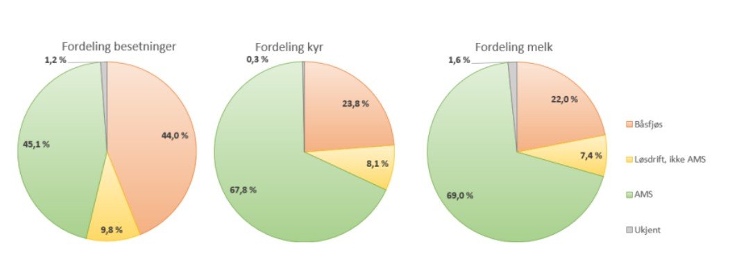 I 2024 var 55 % av norske besetninger løsdrift. Videre kan vi se at hele 75,9 % av kyrne i er i løsdriftsfjøs og står for 76,4 % av melka. Se illustrasjon: